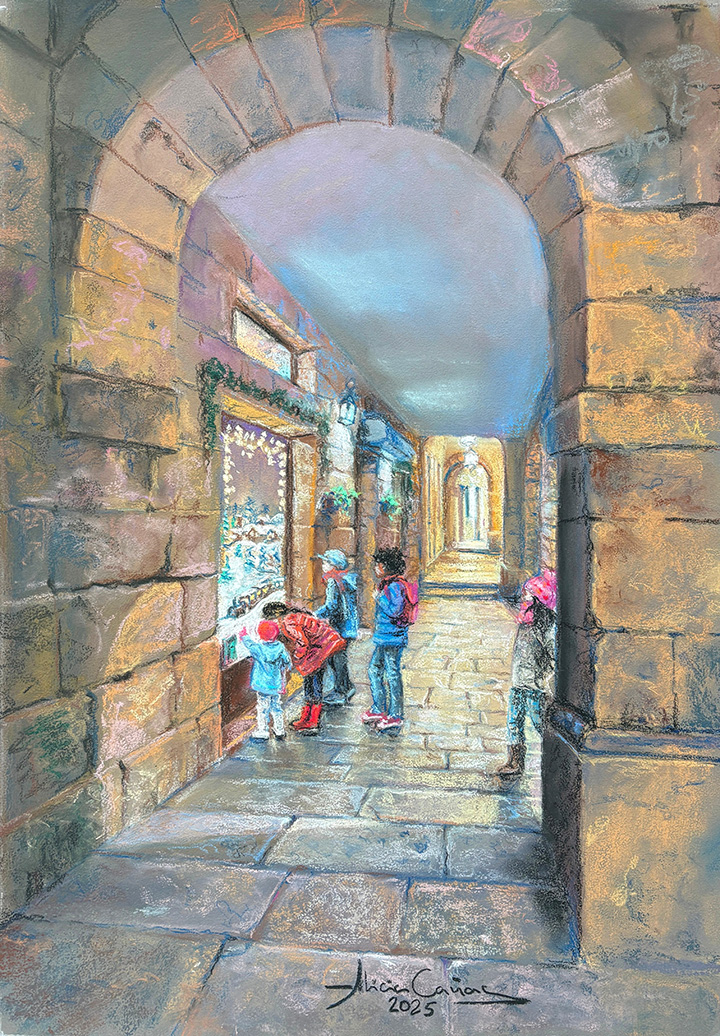 Se trata de una pintura al pastel, en la que unos niños y niñas miran ilusionados, en estas fechas, el escaparate de una tienda de una de las calles más emblemáticas de Reinosa. La imagen representa cómo la decoración navideña nos ilumina y nos conmueve, sobre todo cuando se comparte con los demás, y evoca la ilusión con la que se espera y se vive la Navidad, especialmente en la infancia.