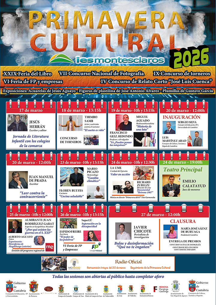 El martes 17 de marzo comenzará uno de los grandes eventos culturales que ya forma parte de la agenda cultural de la comarca de Campoo y de toda Cantabria, la undécima Primavera Cultural del IES Montesclaros que llevará su ciclo de conferencias hasta el 27 de marzo con la intervención del periodista de investigación Javier Chicote.