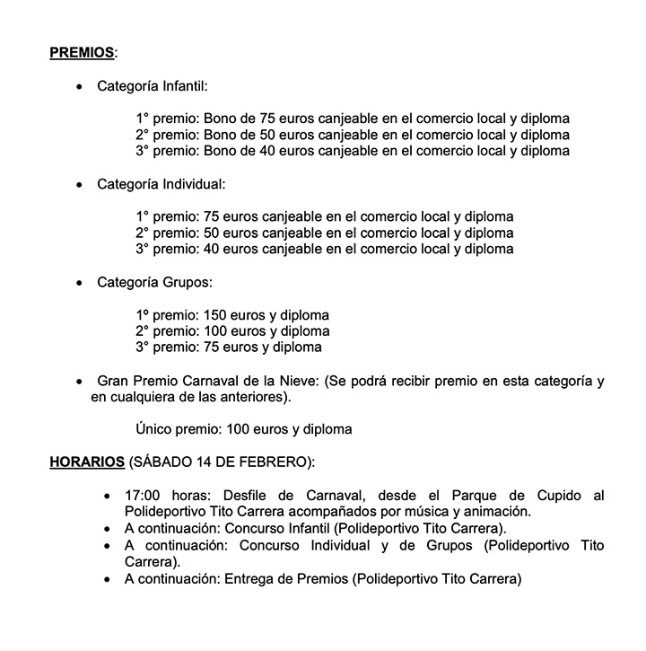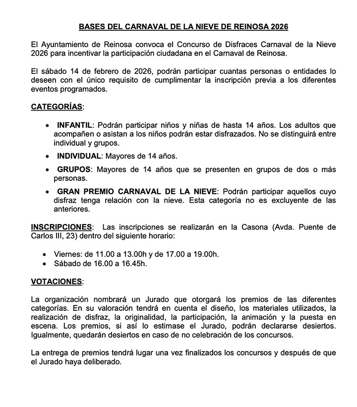 Reinosa celebrará su Carnaval de la Nieve este próximo sábado, 14 de febrero, a partir de las 17.00 horas con el inicio del ya tradicional desfile que partirá desde el Parque de Cupido y concluirá en el Polideportivo Tito Carrera, donde, a continuación, tendrá lugar un Concurso de Disfraces. Habrá 4 categorías de participación: una infantil, destinada a niñas y niños de hasta 14 años, además de la individual y la de grupos para mayores de 14 años y el Gran Premio Carnaval de la Nieve, al que podrán optar "todos aquellos cuyo disfraz tenga relación con la nieve".